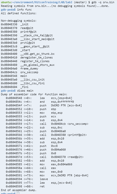 첫 호출이 orw_seccomp인데, prctl도 보이는 것을 보니, seccomp 모드를 설정하거나 함수 제한을 하는 것 같습니다.