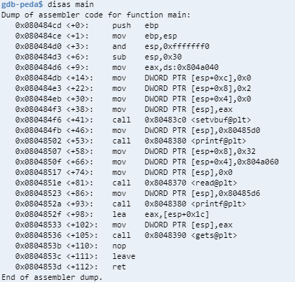 알아보기 쉽게 변수에 값을 넣고, esp에 gets의 return address를 확인해 보았습니다. 변수의 크기는 총 20byte이고, 변수의 address와 gets의 return address 사이의 차이는 0xffffd59c - 0xffffd5bc = 32입니다.
