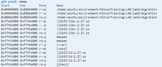 peda에 있는 vmmap과, 이전 각 메모리 영역을 볼 수 있는 objdump -h를 이용해서 쓸 공간을 찾을 수 있습니다.