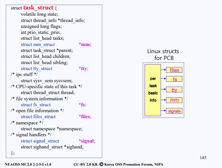 이를 위해서 운영체제에서는 PCB(Process Control Block)이라는 자료구조(구조체)를 만들어 사용한다. Linux의 경우 task_struct라는 구조체를 이용한다.