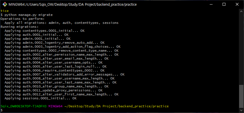 이후 manage.py를 통해 migration을 한다