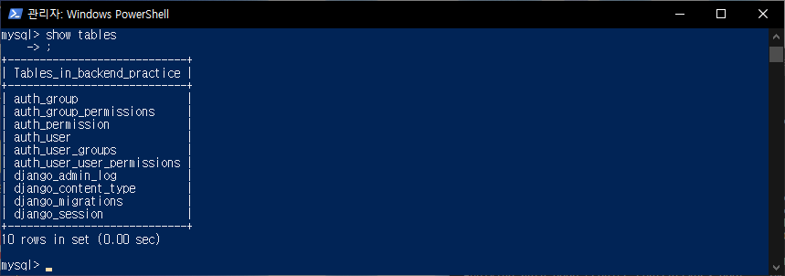 mysql > show tables; 명령어를 통해 마이그레이션 여부를 확인해본다.