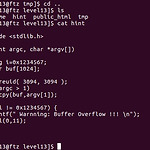 ============================================hint 다음은 /usr/bin/bof의 소스 코드이다. #include #include #include main(){ char buf2[10]; char buf[10]; printf("It can be overflow : "); fgets(buf,40,stdin); if ( strncmp(buf2, "go", 2) == 0 ) { printf("Good Skill!\n"); setreuid( 3010, 3010 ); system("/bin/bash"); } } 이를 이용하여 level10의 권한을 얻어라.============================================ /home/level9/tmp에 동일한 소..