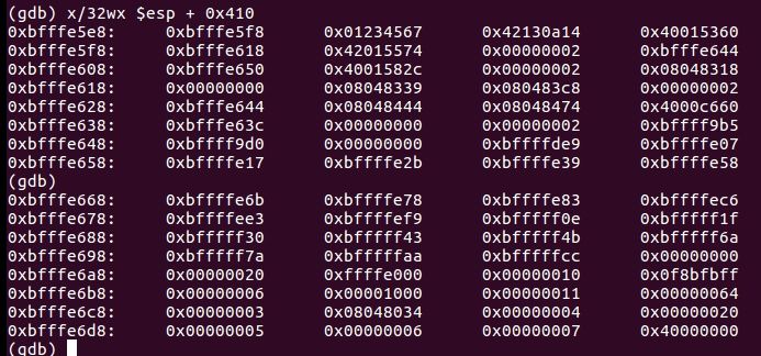$esp + 0x412 부분에 0x01234567이 들어간 것을 볼 수 있습니다. x/x $ebp를 하면 ebp는 0xbfffe618이므로, 옆의 0x42015574는 RET입니다.